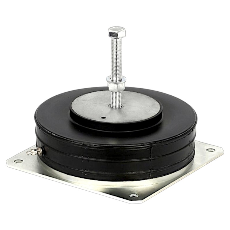 Эластомерно-металлическое соединение с напольной плитой, воздушная камера из эластомера, усиленная стальным каркасом, подача воздуха через вентиль автомобильной камеры, 8 типоразмеров. Корпус и опорная пластина изготовлены из оцинкованной стали.