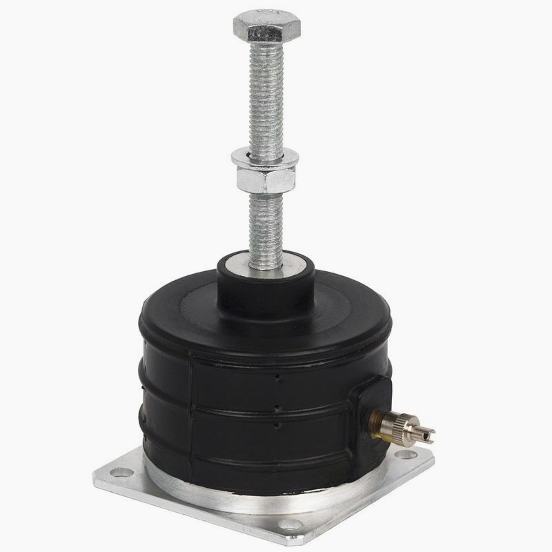 Эластомерно-металлическое соединение с напольной плитой, воздушная камера из эластомера, усиленная стальным каркасом, подача воздуха через вентиль автомобильной камеры, 8 типоразмеров. Корпус и опорная пластина изготовлены из оцинкованной стали.